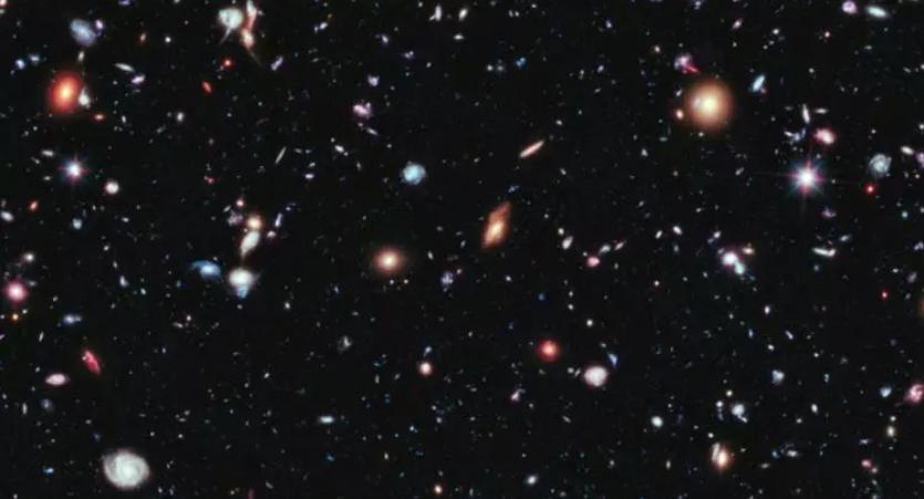 在我身后的这张图片,是天文学上非常著名的一张图片,它叫做哈勃深空图,这是使用著名的哈勃天文望远镜拍摄的,它所拍摄的是天空的一小部分,它的大小可能也就是我们用手举起来一支笔那么大,我们在图上看到的所有光点,都不是一颗恒星,它们事实上都是代表了一个银河系,每一个光点,都有 1000 亿个恒星在其中。