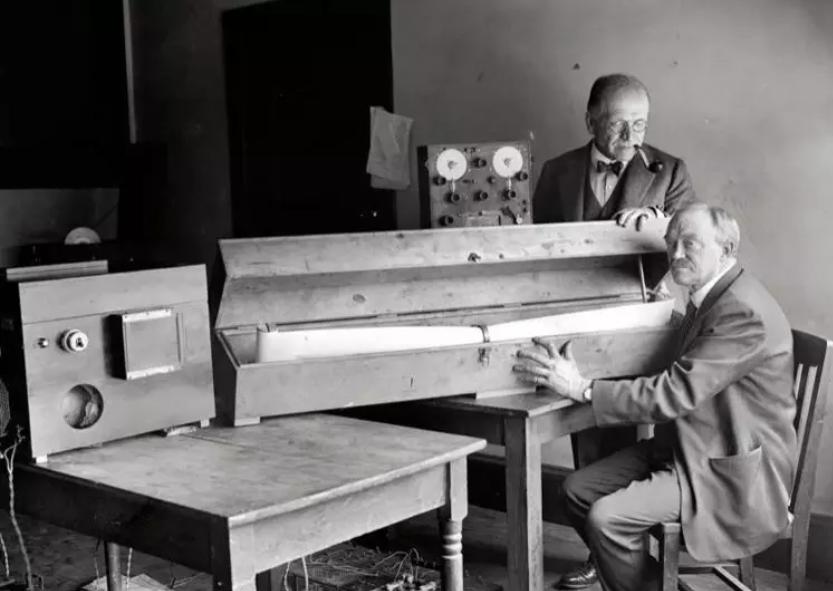 在无线电技术开发之后,我们希望能够用这个技术探测在银河系当中其他的文明。我们做的第一个实验是寻找其他在宇宙当中的智慧生命。这位天文学家名叫戴维,是一个电器工程师,他们两个人进行合作,他们身边的这个设备叫做无线电照片信息机,听起来有点像一部电视,实际上这个设备就是一个电视,这就是我们电视信号接受机的一个早期模型。