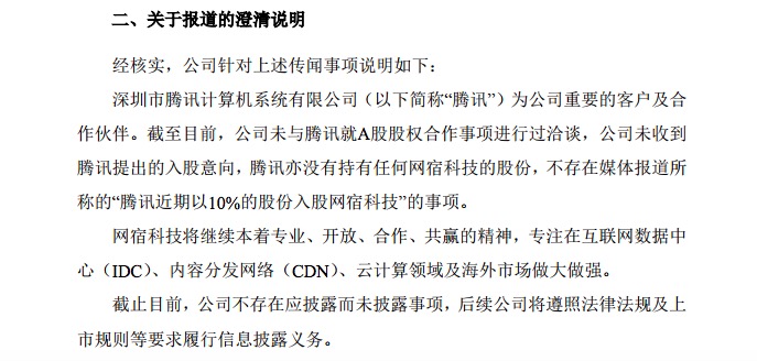 1月28日,网宿科技发公告称,并未与腾讯就A股股权合作事项进行洽谈,也没收到过腾讯提出的入股意向,腾讯亦没有持有任何网宿科技的股份。此前(1月26日),据财经报道,腾讯近期以10%的股份入股网宿科技,若按后者324.32亿元市值计算,腾讯注入后者资金将超30亿元。