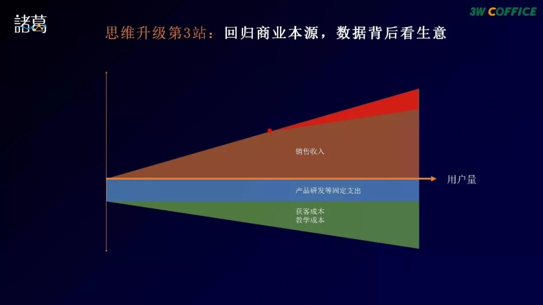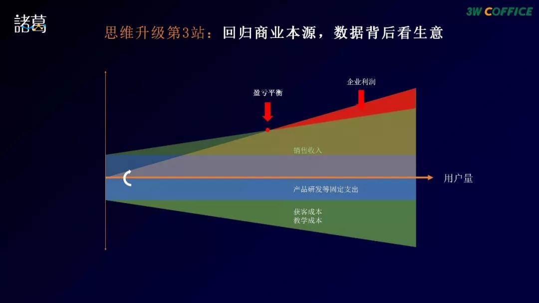 只有提升用户量,才能实现销售额的增长,这是企业财务的开源部分。另外资金节流成本控制,包括在产品研发、课程设计,用户调研、人力资源管理方面的投入。此外,随着用户的增加,运营和服务的成本也将随之增加。之后当收入与成本相当时,才是企业盈亏平衡的状态,之后企业才能进入获利阶段。
