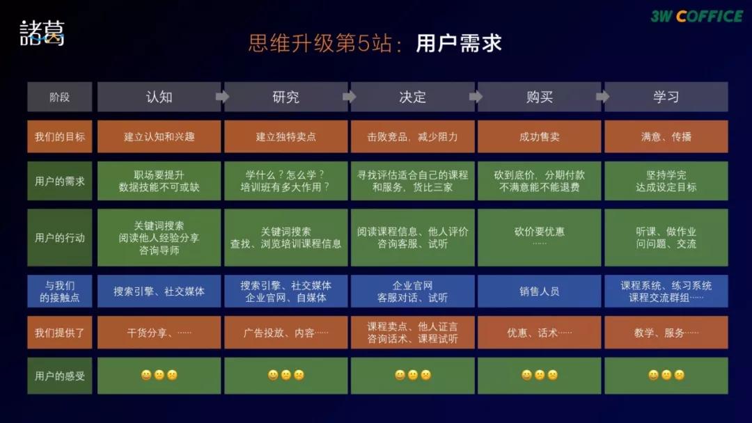 用户的需求是随着五个阶段的深入而不断变化的。比如:我打算学习数据分析,在有了这个想法后才进入第二步:研究一下,应该学什么?怎么学?然后进入第三步:寻找和评估适合自己的课程和服务。比如数据分析,有些是讲数据分析技术的,有些是讲方法论的,有些是讲实践的。不同的课程,满足不同角色的不同需求。比如:产品经理/运营部门与研发和技术对于数据分析的技能需求是不同的,小白运营与资深运营对于数据分析的技能诉求也不同,经过比较找到一家更适合自己的。之后进入购买阶段,评估购买能力,评估付款方式,评估付款风险等。一旦决定购买课程后,就需要坚持学习,达成最初设定的目标。