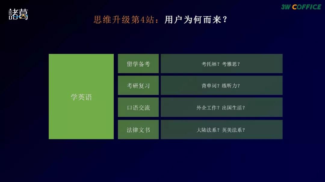 这里,我们要明确用户到底为何而来?以英语学习类产品为例,用户学习的目的很多:出国留学、雅思托福、考研等。在界定清楚不同目的后,才能提供相应的产品和服务,帮助用户更好的实现学习目标。