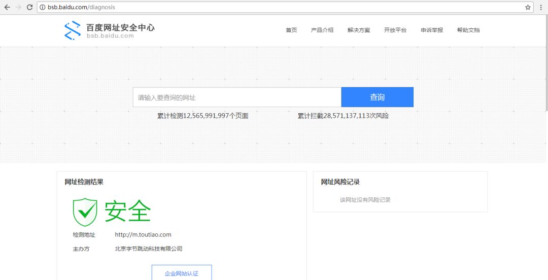 证据六:使用百度在线网站安全监测网站(http://bsb.baidu.com)查看,证明今日头条网站没有安全问题并可以稳定访问。