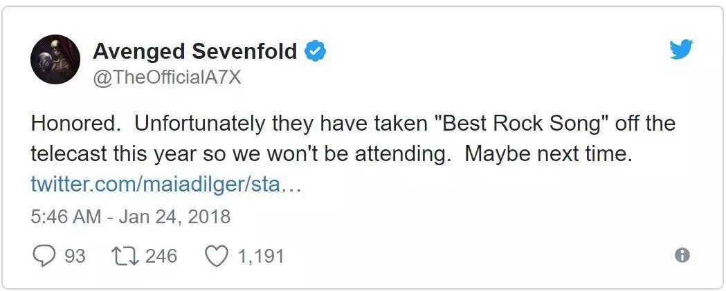 出于这些原因,一些歌手甚至以不出席格莱美奖作为他们抵制格莱美商业化的行动。譬如在今年,获得格莱美“最佳摇滚乐”提名的Avenged Sevenfold就于早前宣布将不会参加颁奖典礼,并且乐队的官推也发布了这一消息。而Avenged Sevenfold拒绝出席的理由,正是因为摇滚类项目颁奖将不会有视频记录,让乐队的成员感到自己不被尊重。