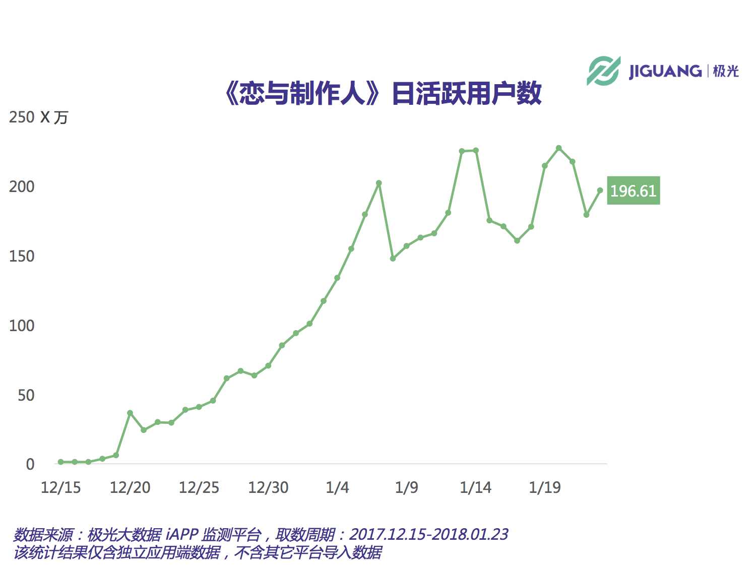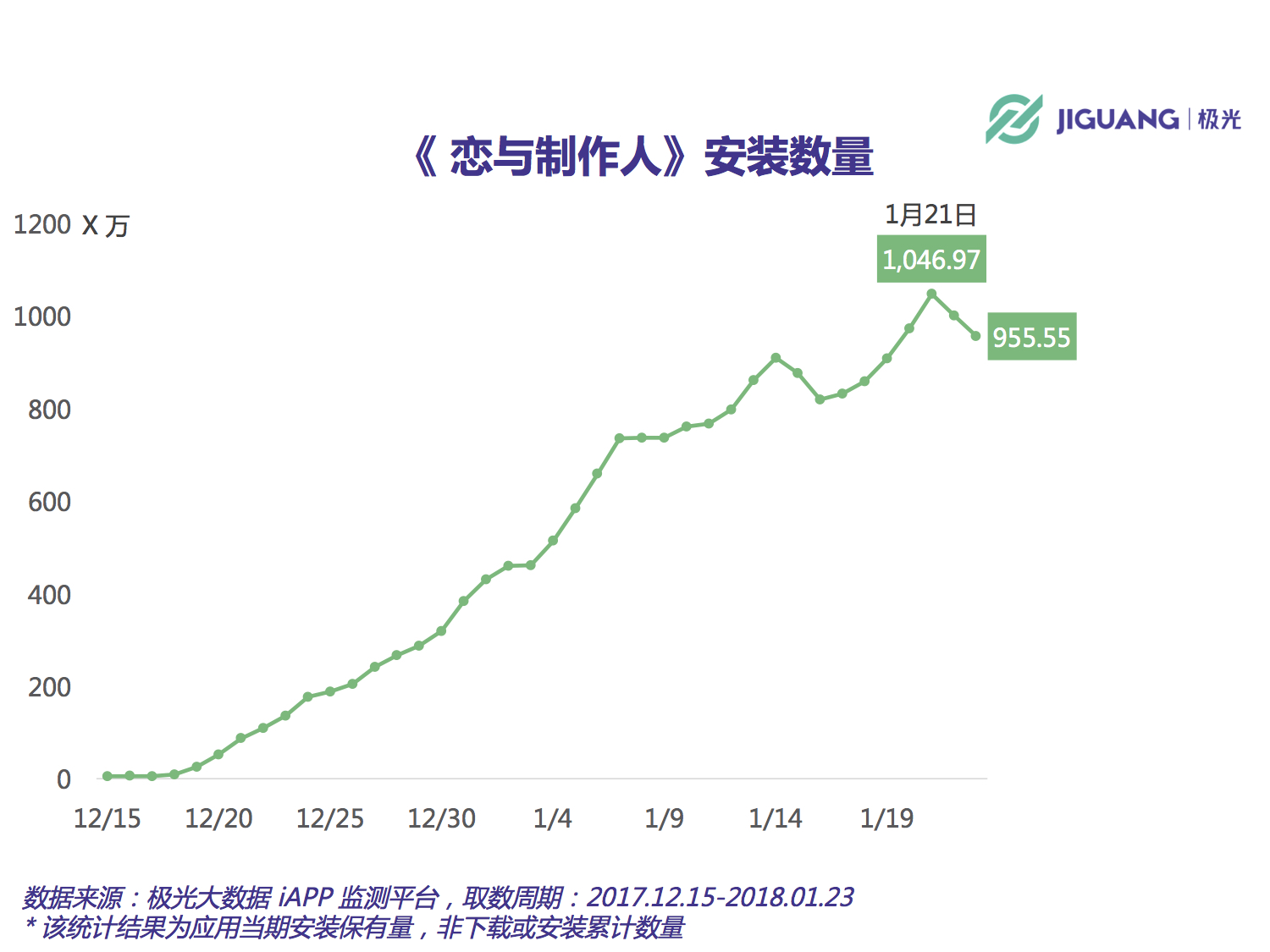 从下图可以看出,12月18日进入快速增长的阶段,1月14日以后,《恋与制作人》的安装量基本进入平稳震荡期。1月7日后,日活也进入震荡期。