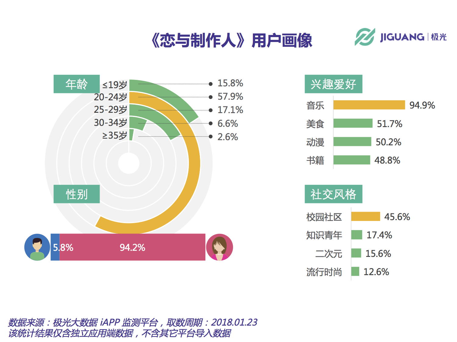 先来看下《恋与制作人》,这是一款备受女孩青睐的恋爱经营手游。女性比例占94.2%,20—29岁居多,共计占75%,也就是对爱情需求最强烈的年轻女性是其核心用户。社交风格中,校园社区占45.6%,表明在校学生占据了相当比例。
