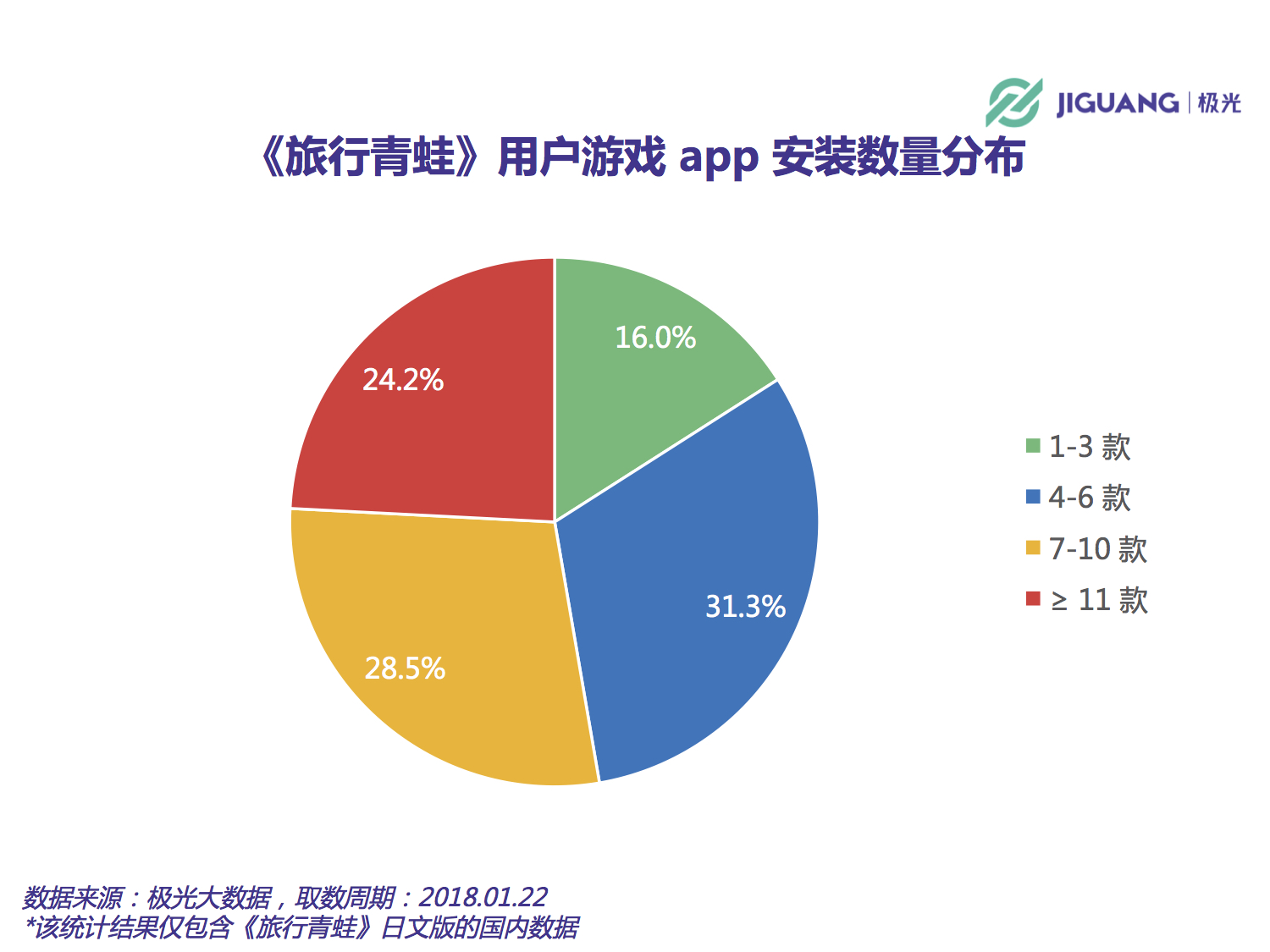 《旅行青蛙》的6成用户安装了4-10款游戏,只有16%的用户安装了1-3款游戏。这在一定程度上说明,《旅行青蛙》的用户以游戏中度玩家为主。