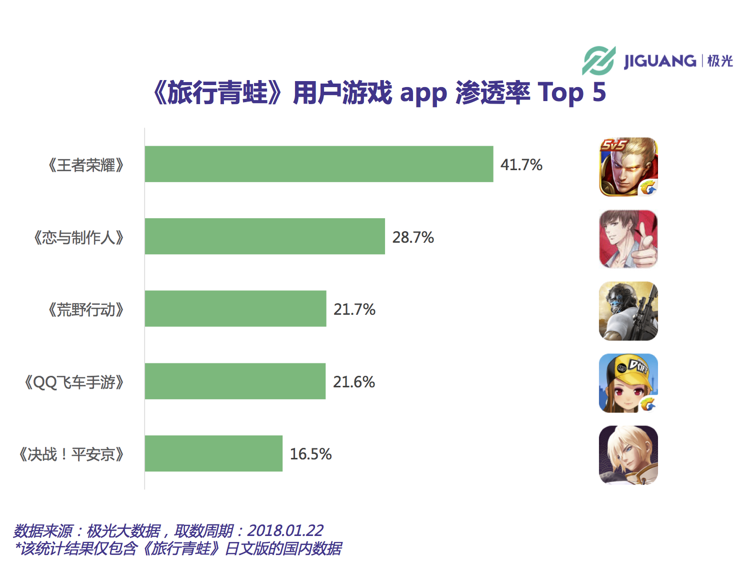 《旅行青蛙》具体的用户画像暂未公布,但无疑的是,这款游戏的用户也是女性居多。《旅行青蛙》用户手机端其他游戏类app渗透率前三分别为《王者荣耀》、《恋与制作人》、《荒野行动》,其中《恋与制作人》的渗透率达到28.7%。不难推测,两者存在一定的竞争关系。