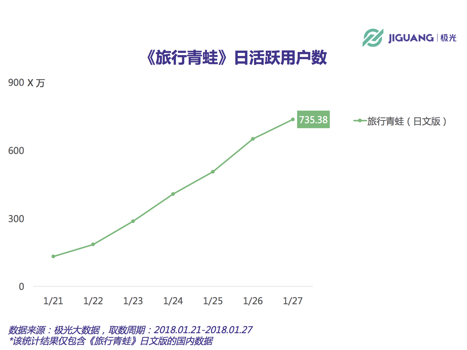 相比之下,《旅行青蛙》正如日中天。从该游戏被讨论的舆论热度也也想而知。从1月20日起,《旅行青蛙》进入了为期一周的指数级增长。截至1月26日,青蛙游戏国内安装量超过2200万,日活超700万。