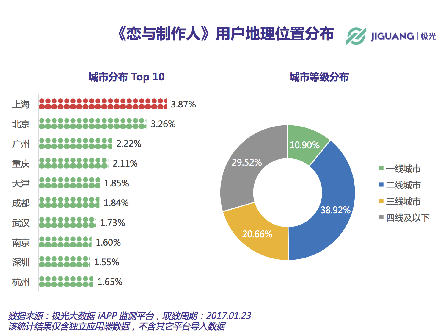 从用户的地理位置分布上来看,《恋与制作人》虽然在北上广三个一线城市的用户最多,但是综合来看,这款游戏在二线城市的占比较大。