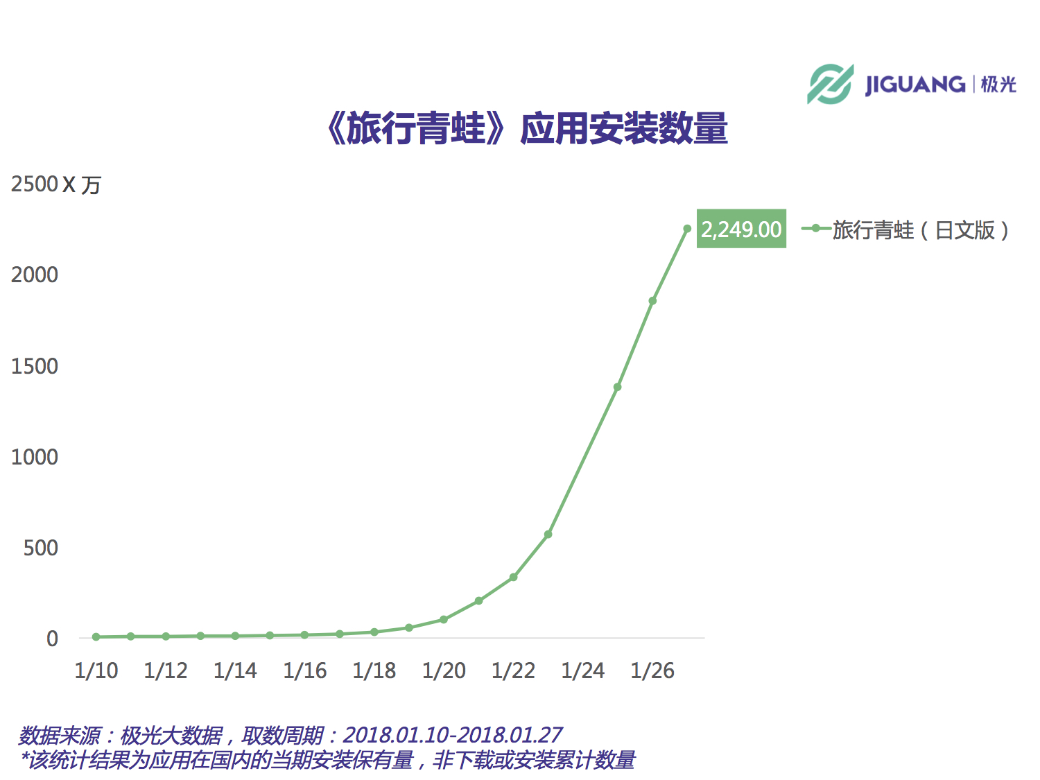 极光数据的数据显示,《恋与制作人》目前活跃用户已经进入稳定期,《旅行青蛙》(日文版,下文均指同义)依然处于高速增长期,目前安装量已经突破2000万。