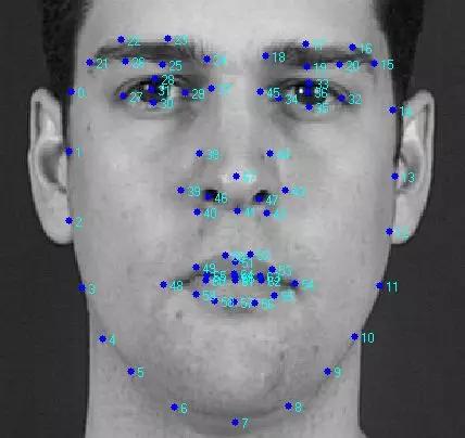目前,市面上大多数人脸识别技术通常使用「68 特征点」来标注人脸特征,譬如左眼、鼻梁等重要部位的相对坐标。