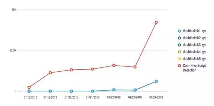 趋势科技发布的分析报告称,2018 年 1 月 24 日,他们观察到由于恶意广告活动,Coinhive 矿工人数增加了近 285%。他们还发现,在用户流量高的网站上不只使用 Coinhive,而且还使用了独立的网络挖矿工具并连接到了私人矿池。此前在 1 月 18 日,他们开始看到五个恶意域的流量增加,仔细检查网络流量后发现流量来自 DoubleClick 广告。