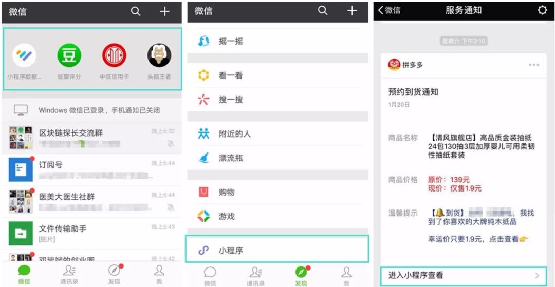 微信群里面,你可以把小程序的链接丢进去,在公众号中也可以拉起小程序。而且微信的最新版本,往下一拉界面,上面直接有四个最近使用过的小程序入口。而且现在小程序也能弹Push了(通过“服务通知”)。这些都是巨大的入口支持。未来也许有一天朋友圈也支持小程序了,甚至微信哪天给小程序一个一级菜单也说不好。