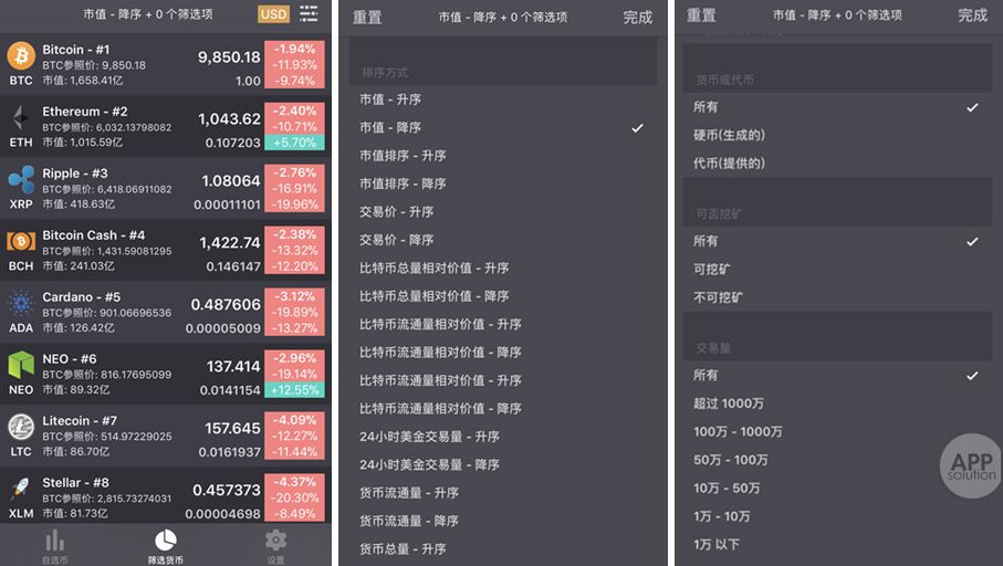 第二栏是筛选货币。Coinn 有 13 种以上的排序方式和6种以上的筛选方式。