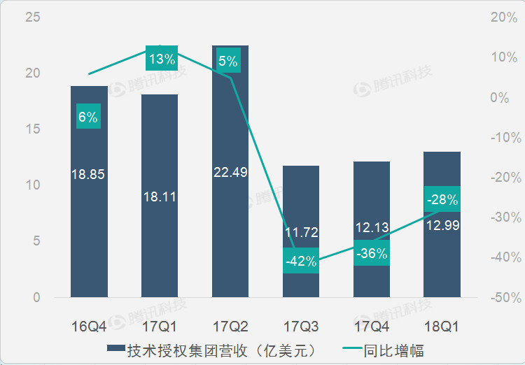 高通技术授权集团第一财季营收为12.99亿美元,与上年同期的18.11亿美元相比下降28%,与上一财季的12.13亿美元相比增长7%。该集团的税前利润(EBT)为8.87亿美元,与上年同期的15.32亿美元相比下降42%,与上一财季的8.29亿美元相比增长7%;税前利润在营收中所占比例为68%,相比之下上年同期为85%,上一财季为68%。