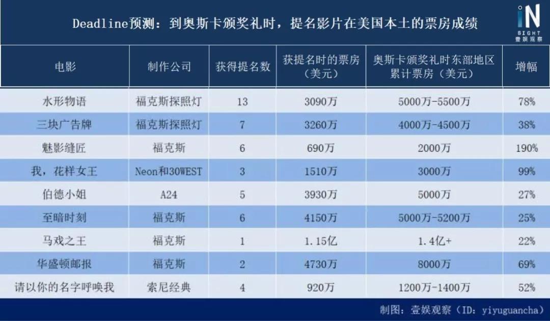 Deadline预测的3月4日奥斯卡颁奖礼之前,这些提名影片在美国本土的票房成绩(数据来源:《Deadline》原文)
