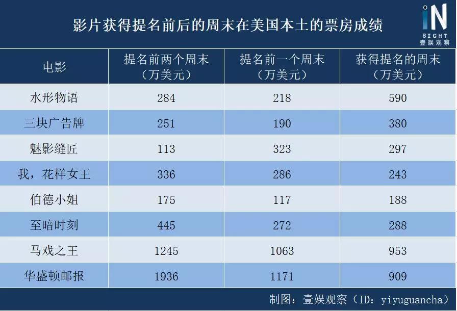 而《华盛顿邮报》在获得提名前后票房差别不大,提名前的周末为1171万美元,提名后的周末为909美元。可见《马戏之王》和《华盛顿邮报》尽管卖座,但由于获提名奖项较少,所以提名对票房并没有产生很好的推动作用。
