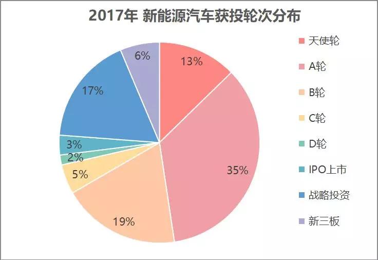 从 2017 年新能源汽车获投轮次分布来看,早期投资事件(指 A 轮及之前的投资事件)占比达 48%,并且主要集中在 A 轮阶段。此外,B 轮阶段和战略投资事件占比也很大,分别为 19%、17%。整体来看,新能源汽车产业还处于一个相对早期阶段,随着新能源汽车产业的发展,整个产业链上下游将会有更多的玩家进来。