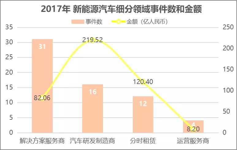 从新能源汽车细分领域的投资事件数和金额来看,新能源汽车解决方案服务商的获投数最多,汽车研发制造商的获投金额最多。