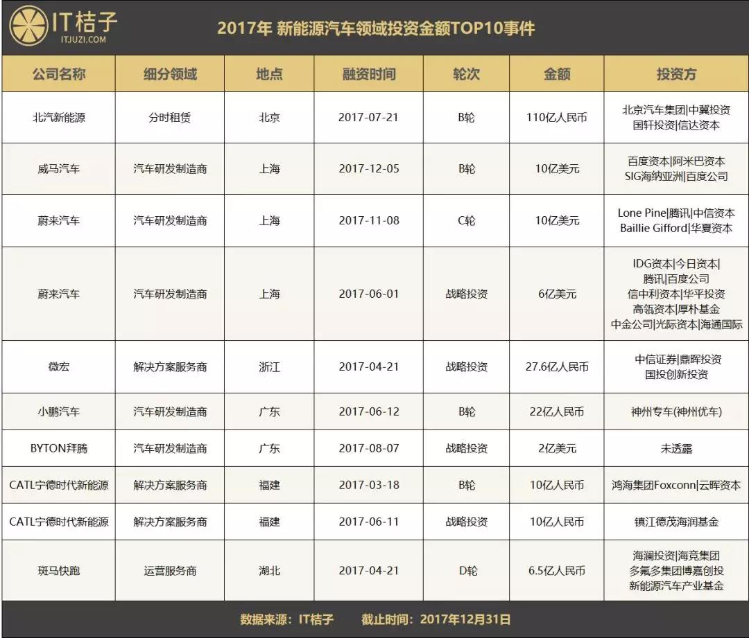 以下为 2017 年新能源汽车领域发生的大额融资事件 TOP10 表单:
