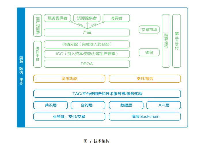 目前溯源链采用的是双主链,由纸贵科技合作开发。底层采用了以太坊的协议,业务层主链采用了自有的协议。溯源链的公链需要由网络节点支撑,这方面团队借鉴了EOS的思路,设置了21个超级节点,前期在参与方中选择,后期则由溯源链上的各方投票选举产生。节点通过共享主机云服务获得服务交换或代币奖励。