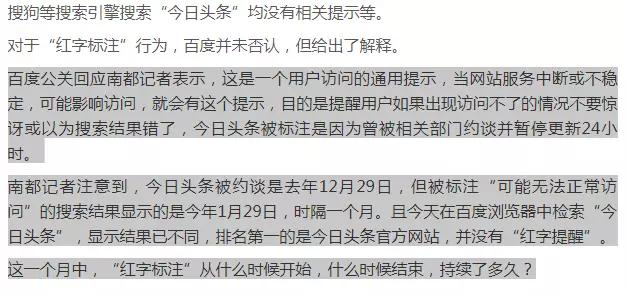 第一点:请百度明确“不稳定”的真正原因,不要前后矛盾。头条认为,百度在回复《南方都市报》记者时,称是因为头条被约谈所以网站变为不稳定,这和这次解释完全不同,请问到底何者为真?此外,记者在采访时,就已经指出这一解释的不靠谱——今日头条是12月29日被约谈,我们发现“被不稳定”,是1月29日。
