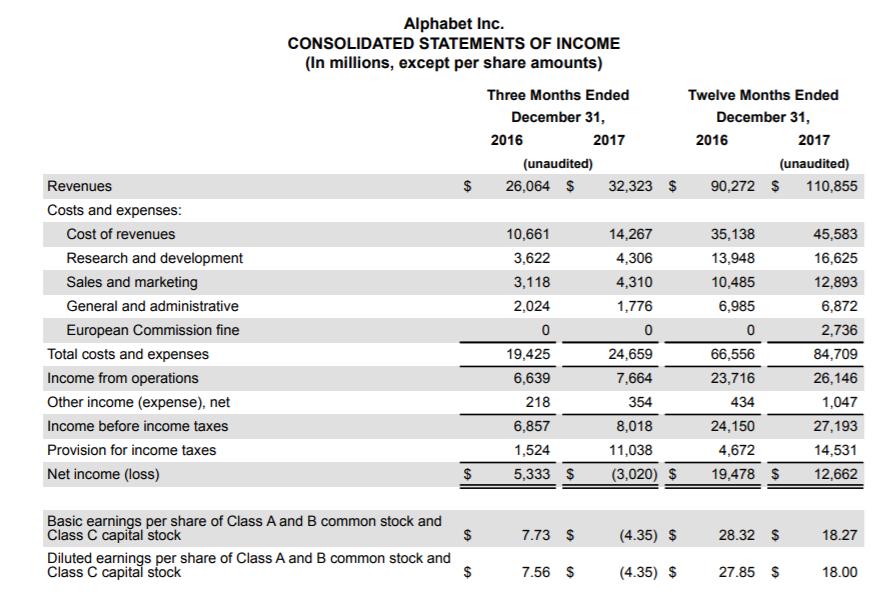 纵观全年,Alphabet销售额首次破千亿,达到1109亿美元,较2016年增长了23%。但由于受到特朗普税改和欧盟反垄断起诉(27亿欧元罚款)的影响,Alphabet年利润较去年同期下降35%,至126亿美元。