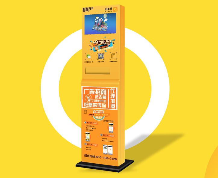 目前,纸老鼠已经研发了一款立地式纸巾装载机,装载量为98包,在机身下方附有能储存298包纸巾的储纸柜,但要靠人工将纸巾放入纸巾机。纸巾机高1.6米,上方配有15寸高清液晶显示器,下方配有可定制广告位,全天24小时工作,耗电量为15度/月。