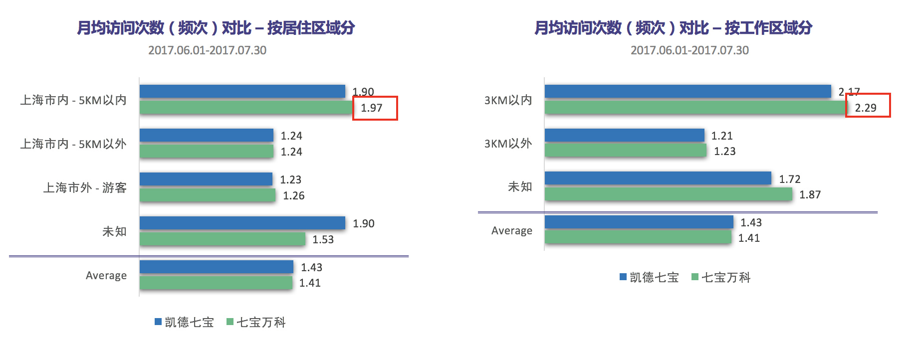 2. 顾客到两个商场的整体月逛街频率并无明显差别,都是在1.4次左右。不过商场周边顾客逛七宝万科稍微频繁一些。