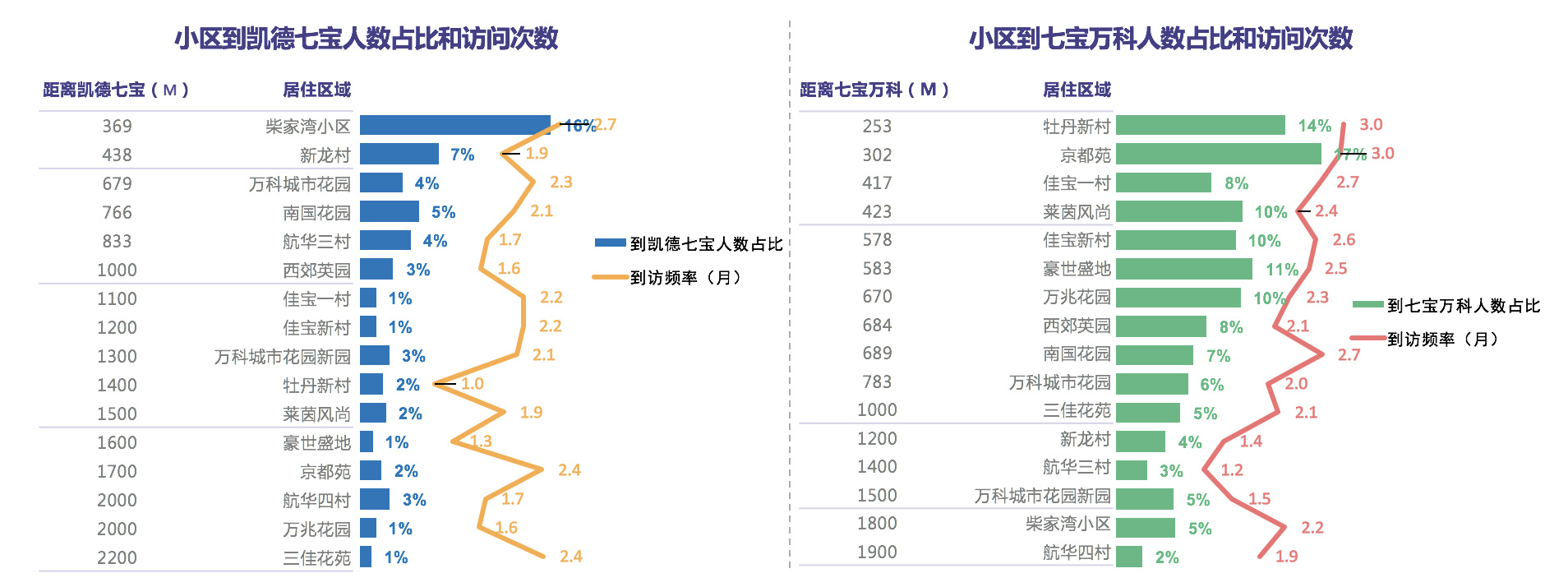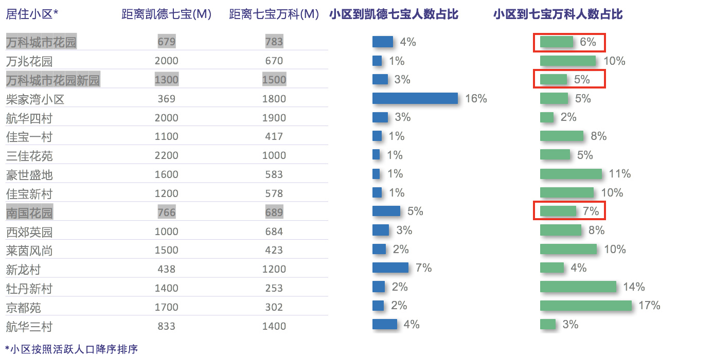 3. 下图中标灰色的小区是到两个商场距离基本上一致的小区,从小区到场的人数占比我们可以看出,即使一个小区到两个商场的距离相似,大家还是更喜欢去逛七宝万科,这方面反应七宝万科的整体吸引力优于凯德七宝。一个是开业两年的七宝万科,一个是开业11年国际知名购物中心-凯德七宝。七宝万科在2年时间内就实现了整体吸引力高于凯德的成绩,这个说明万科在商业地产经营能力和经验方面功底非常深厚。