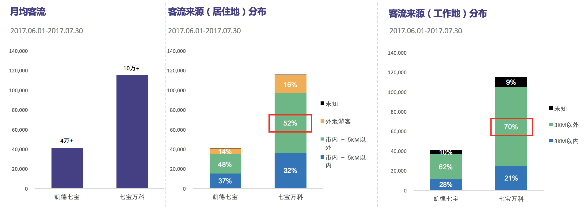 1. 七宝万科的整体客流明显多于凯德七宝,约为后者的2.8倍。七宝万科中周边人群占比很高,这说明万科在交通便捷性及整体吸引力方面优势明显。