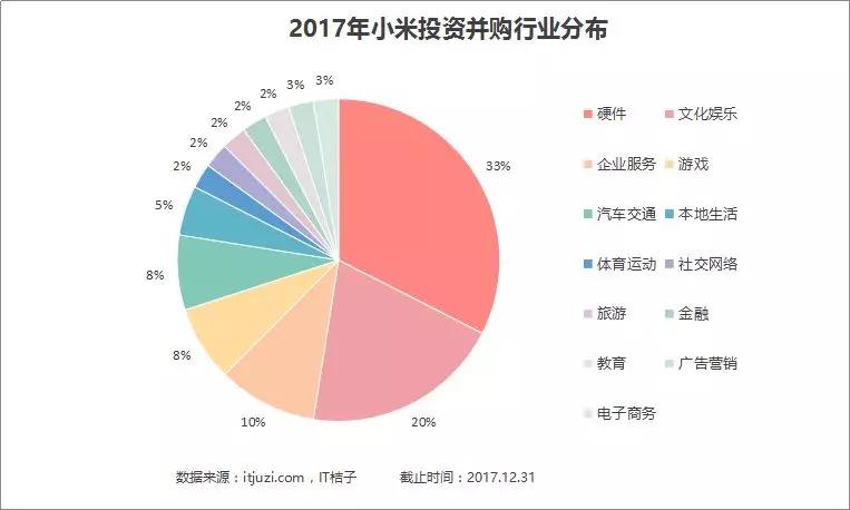 根据占比情况具体分析,小米 2017 年投资的两大重头为硬件和文化娱乐。其中小米作为手机起家的科技公司,对于硬件的投入相当重视。2017 年,小米对硬件相关项目的投资数量占比高达 33%,位于各行业布局的绝对首位。