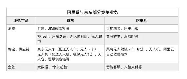 阿里系对手已经在线上线下零售、物流和金融多方面布局,与京东的业务形成高度竞争关系。