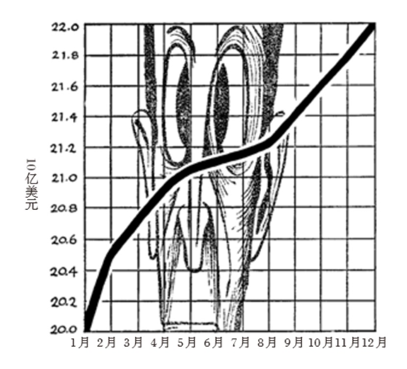 现在够清楚了。这张图展示了国民收入在这一年中每个月的变化。但是画图者会发现,由于这张图是按比例制成,最下面还有一条用于比较的基准线或零线。这10%看起来的确像是10%——虽然也是上升的趋势,但不够令人振奋。