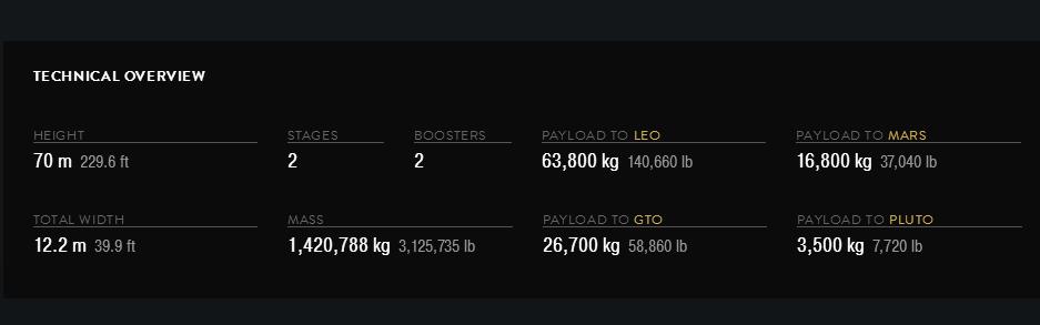 猎鹰重型火箭的技术参数,截图来自SpaceX官网