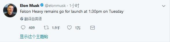 马斯克在Twitter上宣布,美东时间2月6日下午1:30,“猎鹰重型” 火箭将会从佛罗里达州的肯尼迪航天中心发射升空。