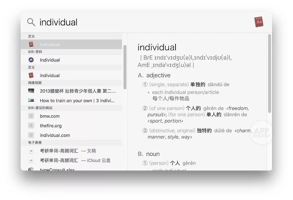 如果你是 Mac 用户,那么你一定知道 macOS 中内置了一个「词典」App,同时如果你在聚焦搜索(即 Spotlight Search)中输入一个单词,「词典」的结果也会展示在其中,非常方便。