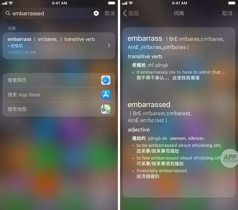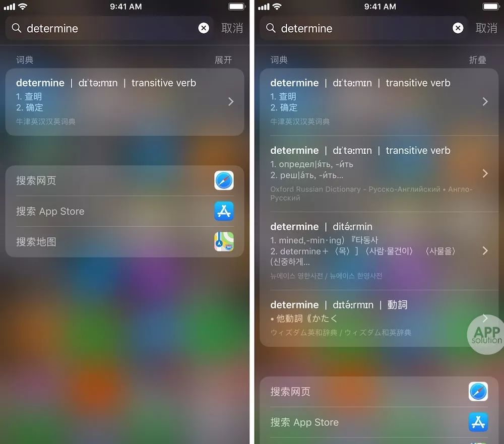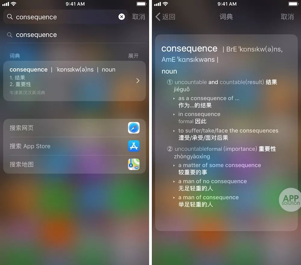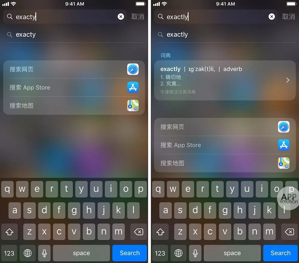 随着 iOS 11 的发布,苹果将词典功能带到了搜索栏,使用更加方便,同时也更像是一个词典了。