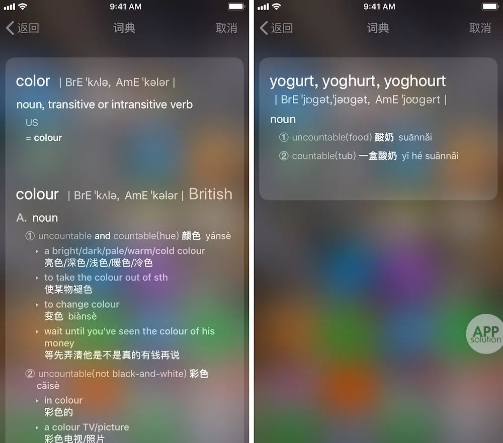iOS 11 内置词典的另一大智能之处在于,它可以自动识别美式拼写和英式拼写,比如输入酸奶 yoghurt,它不但认识,还告诉你这个词有 yogurt、yoghurt、yoghourt 三种不同写法。