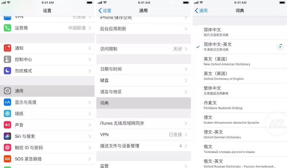 首先,打开 iPhone / iPad 上的「设置 – 通用 – 词典」,接下来选择你会用到的语言,点击就开始自动下载,之后就可以离线使用了。