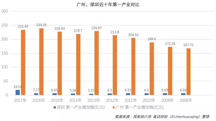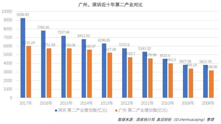 上图是两市第一、第二、第三产业近十年增长情况,从产业分布来看,广州第一产业和第三产业领先于深圳,但第二产业一直不如深圳,而且这几年的差距在拉大。