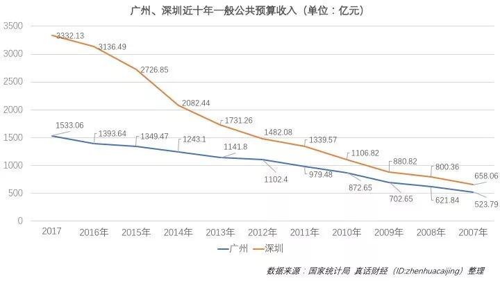 但根据去年的数据,深圳一般公共预算收入3332.13亿元,增长10.1%,广州一般公共预算收入1533.06亿元,增长10.9%,深圳是广州的2倍多。