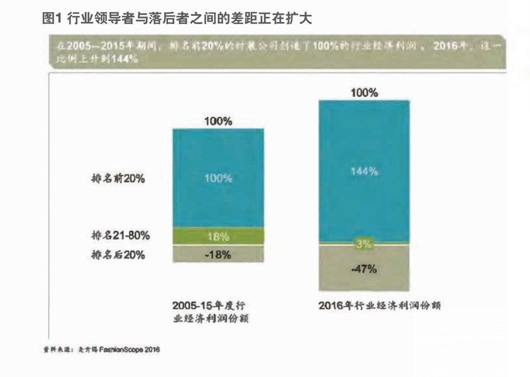 纵观整个时尚行业,尽管市场机会不错,但仍是头部玩家的世界,中小品牌想要做得好很艰难。根据麦肯锡的统计,2005-2015年,排名前20%的时装公司创造了100%的行业利润。2016年,这一比例上升到144%,排名后20%亏损加剧,也就是说行业集中度进一步提升了。