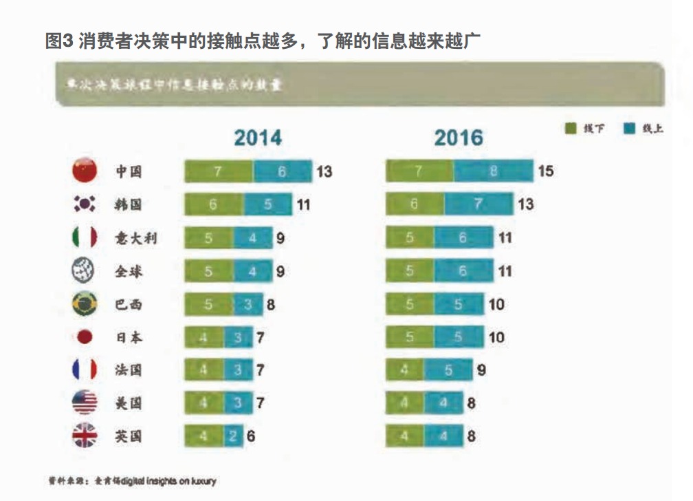 趋势四:信息扁平化。随着科技的发展,消费者和品牌的接触点越来越多。这一点在中国消费者身上体现得尤为明显。根据麦肯锡2017年奢侈品调研,中国消费者在单次决策旅程中平均要经历15个信息接触点,包括7个线下触点和8个线上触点。
