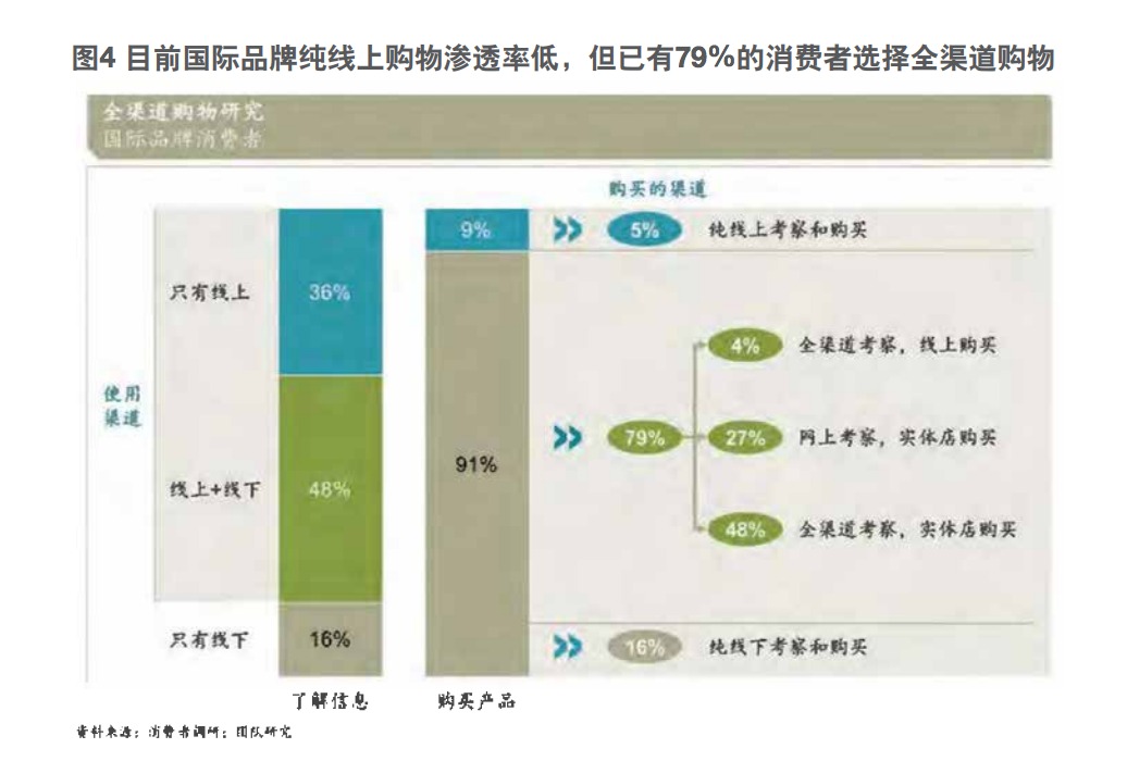 趋势六:渠道合一化。尽管最终购买仍然绝大多数在线下实现,消费者决策旅程已经全渠道化。根据麦肯锡2017年国际品牌消费者调研,只有16%的消费者在线下完成了解、考察和购买的全部过程,而84%的消费者在整个购物过程中受到线上的影响。此外,国际品牌消费者调研表明,60%的消费者表示未来愿意尝试网上购买国际品牌,但产品真伪和购物体验仍存在痛点。