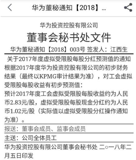 华为公司昨日发放了《关于2017年虚拟受限股分红预测通知》。文件显示,华为预计2017年工会虚拟受限股每股预测收益约为2.83元,每股现金分红为1.02元/股。