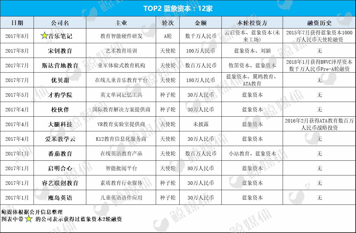 从蓝象资本的投资风格看,其2017年更偏爱于英语类产品以及素质教育机构,其中音乐笔记是唯一一家获得蓝象资本两轮融资的企业。从投资手笔上可看出,2017年蓝象资本投资金额集中在数十万人民币。