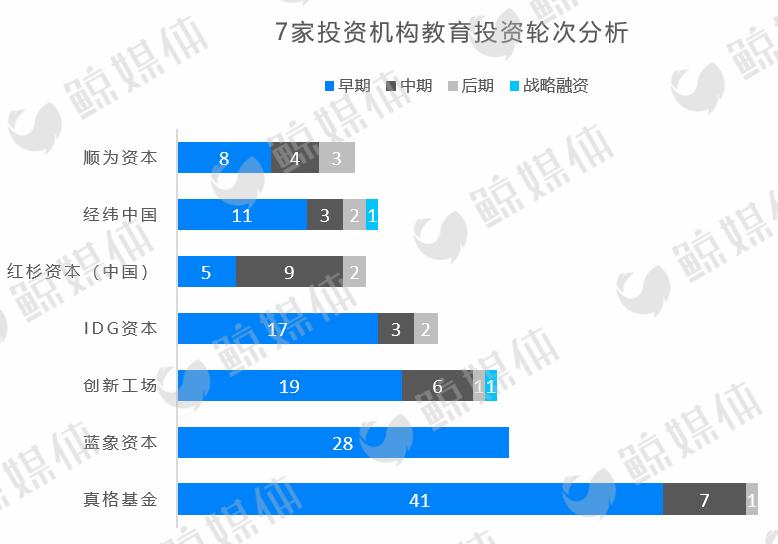 从上图可以看出,7家教育投资机构的投资风格都集中在早期,其中真格基金、蓝象资本、创新工场与IDG资本较为明显,一是因为教育行业的投资热是从近几年才开始,二是教育企业普遍存在生长“缓慢”现象,成长到中后期需要一定时间和经验的积累。