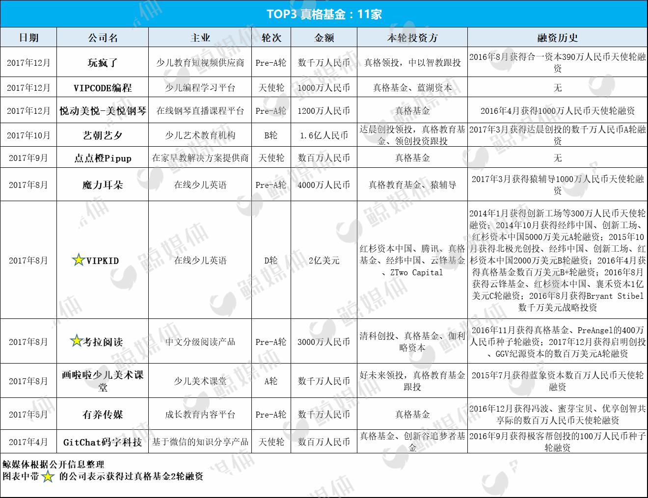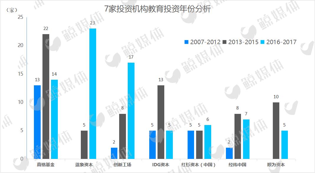 鲸媒体根据公开信息整理了2017年教育投资数量靠前的几家机构的投资情况: